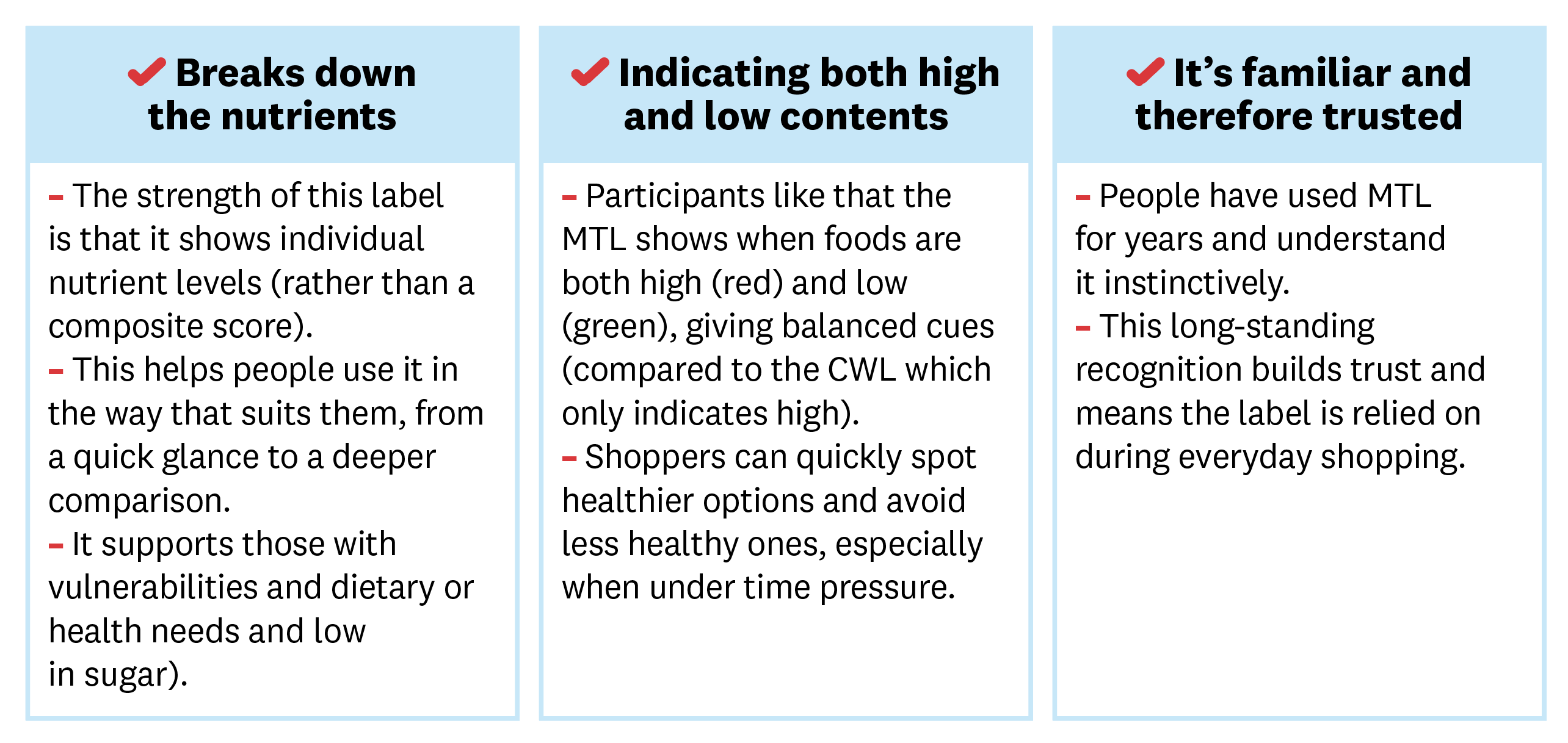 These requested improvements, from increasing the size of the label to making it more visible and better understood, were seen as essential for helping the MTL work well for everyone, especially those who need clearer support to make confident, healthier choices.