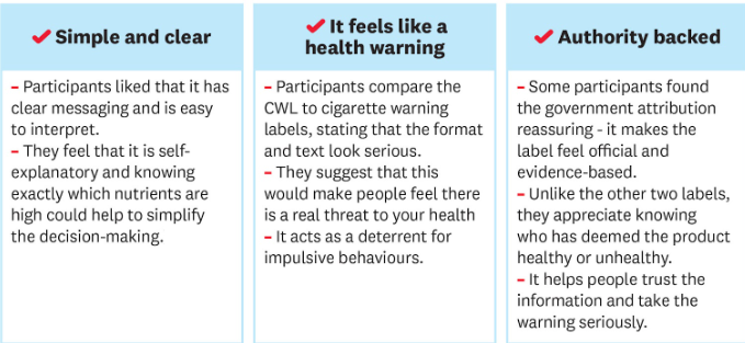 - Chilean Warning Label - The simplicity of the CWL is positively regarded by these groups as it is easy to interpret alongside their other considerations, and the government linked labelling feels trustworthy. However, it doesn’t help to highlight healthy foods, which can be helpful and reassuring for those on low incomes.