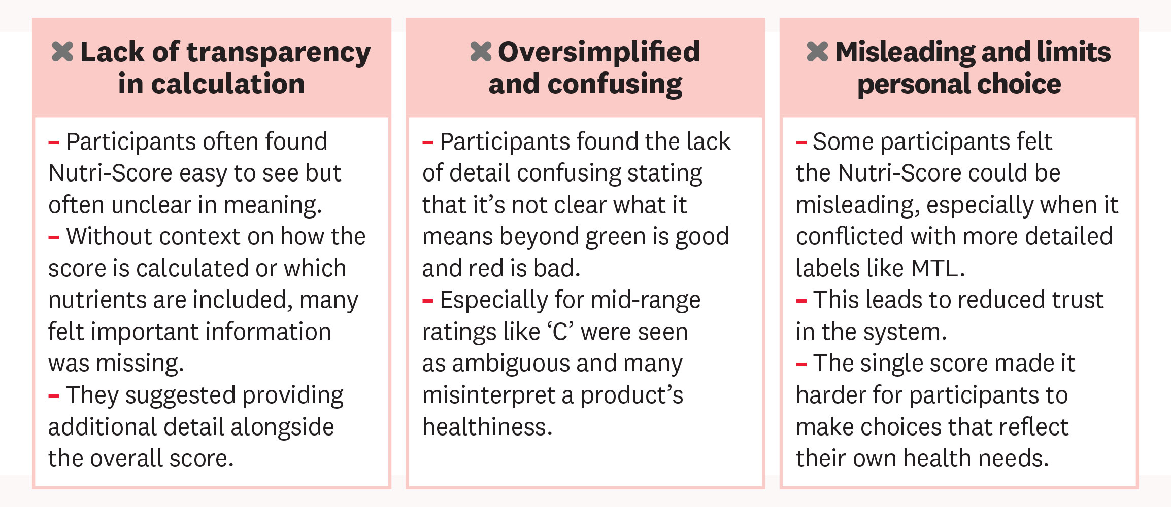 - Nutri-score - The Nutri-score label is often considered too simple as there is no context or detail as to what exactly makes a product healthy or unhealthy - and if participants are trying to avoid/reduce certain nutrients (because of health conditions) this label doesn’t help them.